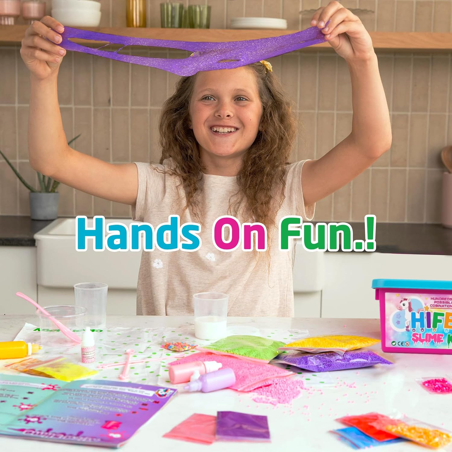 - 57-Piece Kit – Includes slime base, glitter, beads, foam balls, tools & containers.